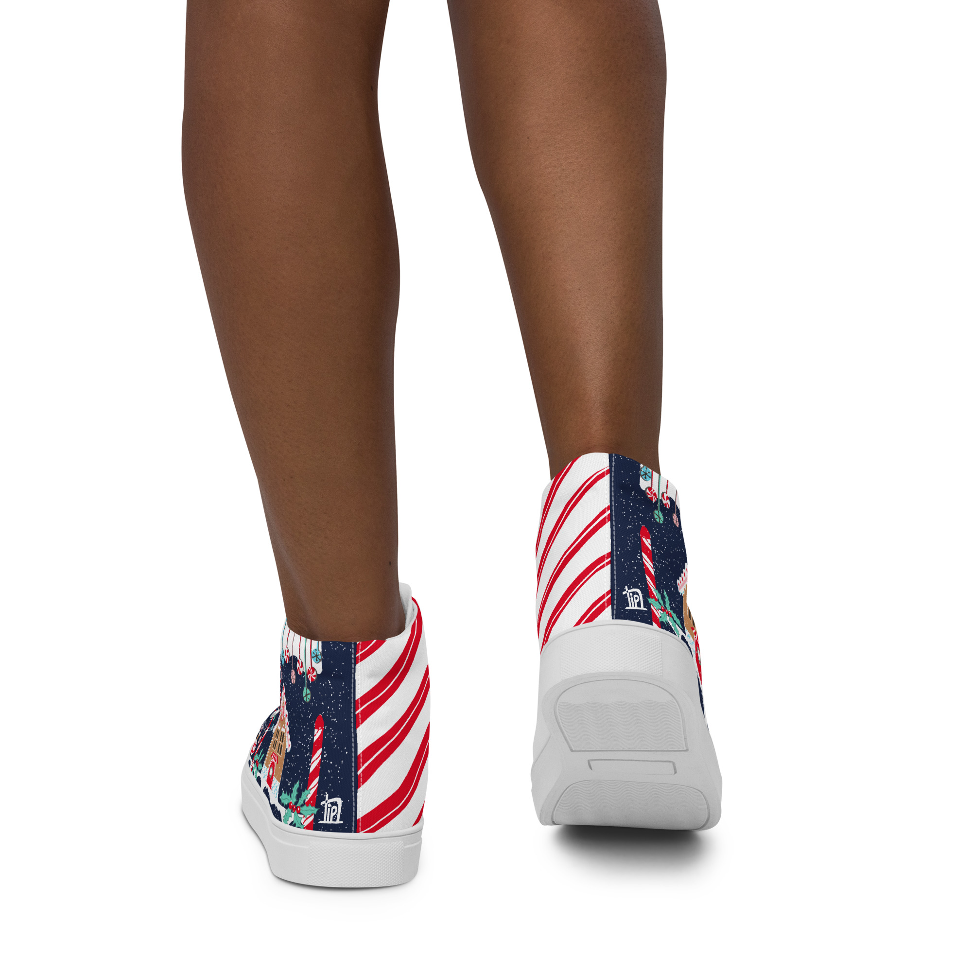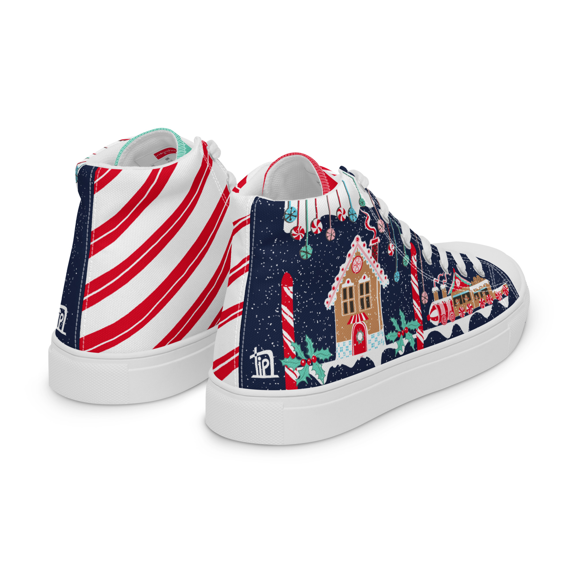 These candy-striped high tops feature frosted gingerbread houses, peppermint swirls, and sweet festive magic — made to turn every sidewalk into a winter wonderland.