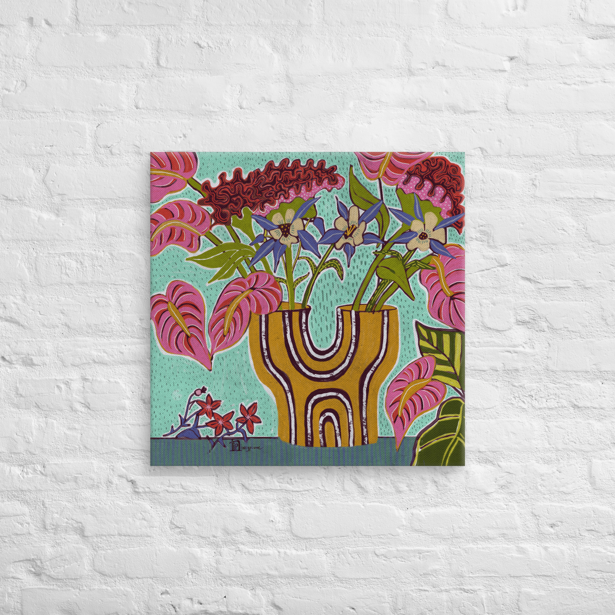 About the Artwork: This archival canvas print is a “Dopamine Decor” essential, designed to bring a sense of fresh, creative energy to a modern kitchen, a bright entryway, or a curated gallery wall. This piece is an exercise in pure artistic play—blending modern ceramic trends with a maximalist approach to botanical textures.The star of the show is a unique, U-shaped “duo” pot in mustard ochre and white stripes, cradling an eclectic mix of flora: sculptural pink Anthurium leaves, delicate purple star-shaped blossoms, and the rich, brain-like ruffles of burgundy Celosia. Set against a cool, textured seafoam green backdrop, the composition utilizes inkyplume’s signature stippling and bold linework to create a sense of three-dimensional life.
