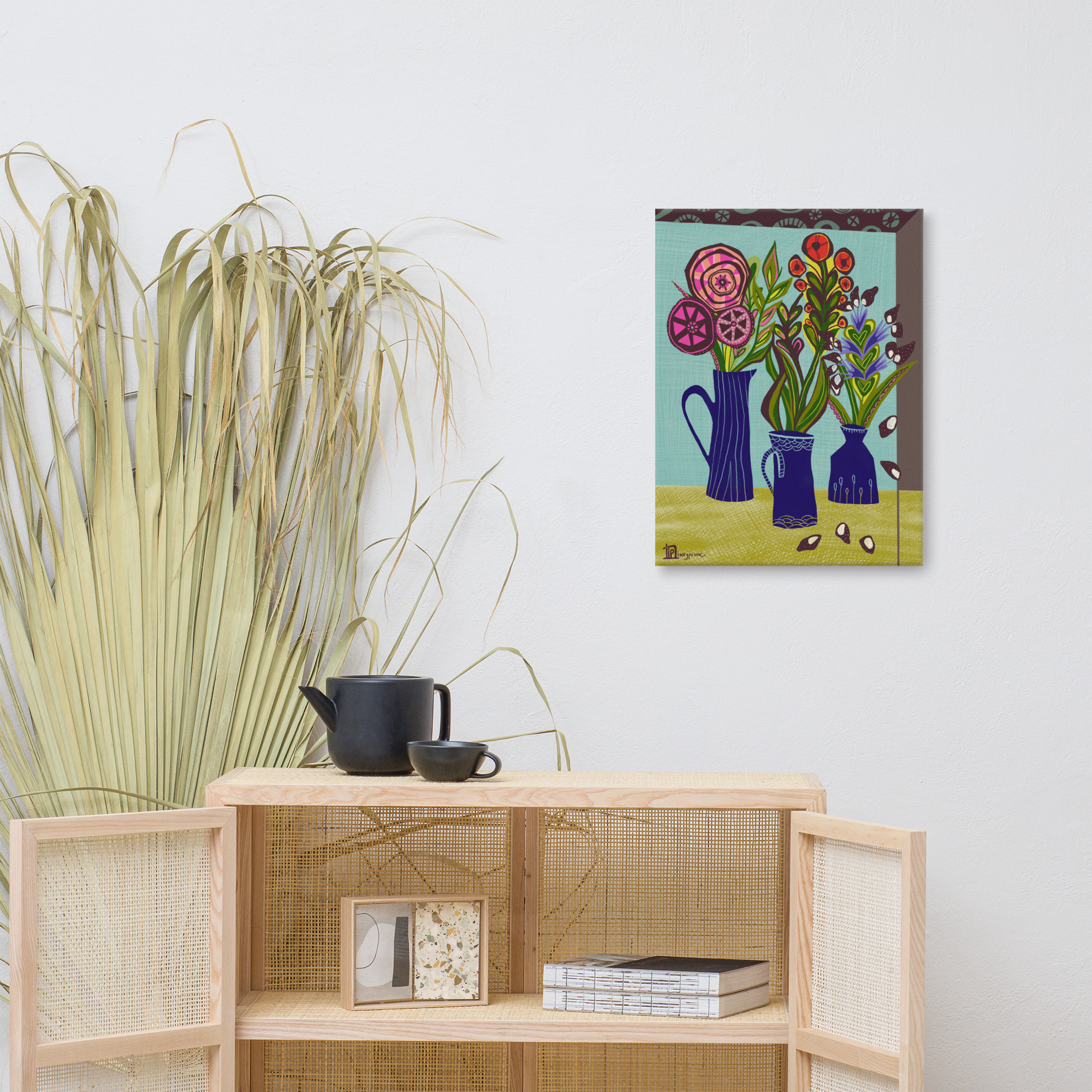 About the Artwork: Set against a serene teal backdrop with a rich plum geometric border, this archival canvas print is a “Dopamine Decor” essential—perfect for a bright kitchen, a creative workspace, or an entryway that needs a punch of color and artisan soul. This piece is a joyful exercise in pattern-on-pattern design, featuring three distinct blue vessels that each hold their own whimsical botanical world. From the tall, hand-drawn stripes of the left pitcher to the intricate scalloped edges of the center vase, every element is a tribute to the “Joy of Creation.” The bouquet features an eclectic mix of inkyplume signatures: layered pink “mandala” blooms, vertical stalks of red-tipped flowers, and a unique blue heart-shaped floral cluster.