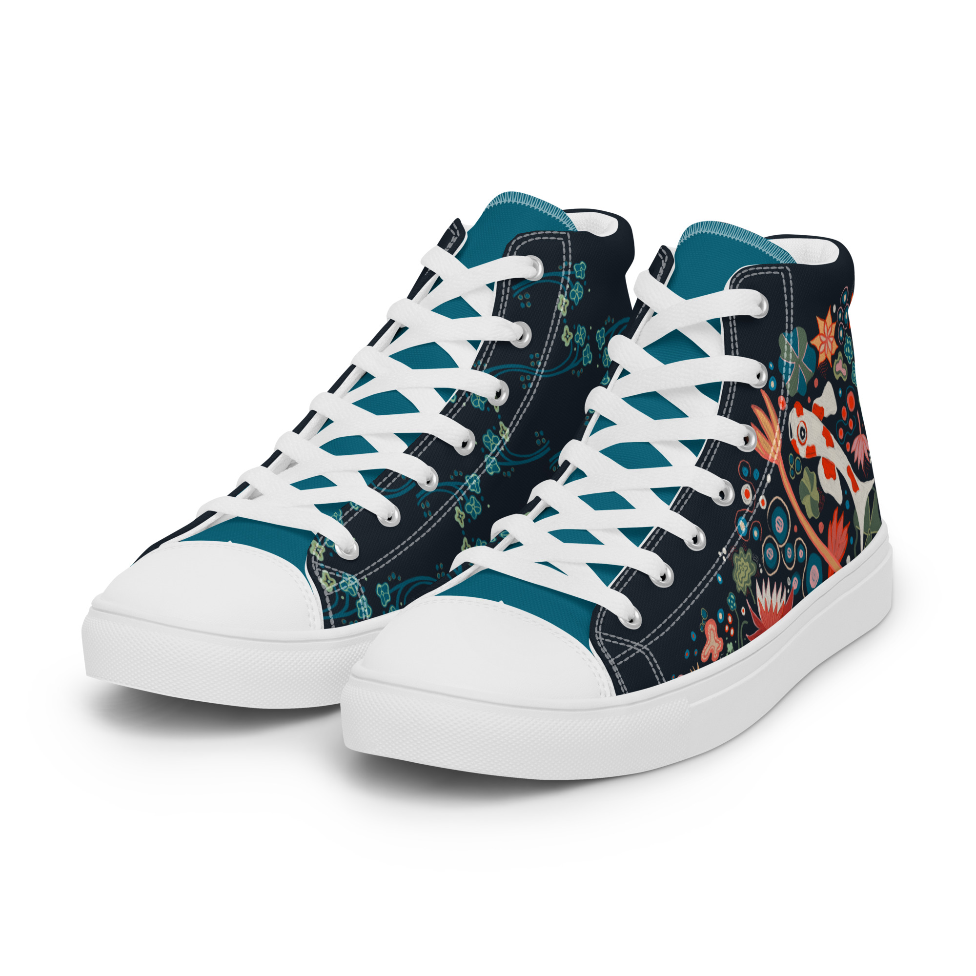 These playful high tops are bursting with energy, featuring a vibrant koi fish zipping through a pond of lily pads and lotus blooms. With punchy reds and oranges dancing against lush teals and cool blues, this design is full of movement, contrast, and joy.