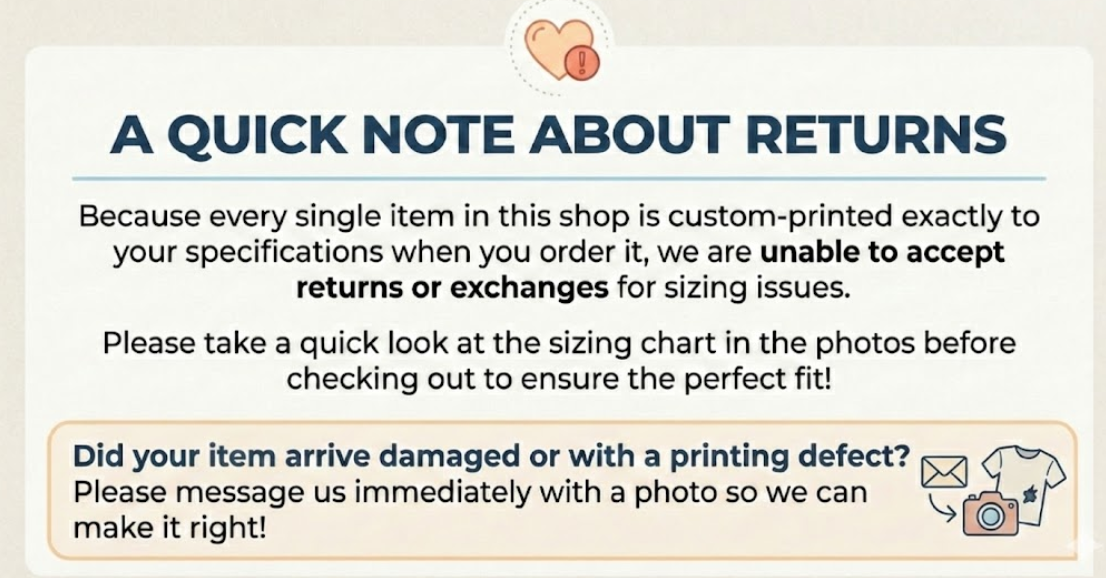 Because this item is custom-made specifically for you, we are unable to accept returns or exchanges. However, if your item arrives damaged or defective, please contact us immediately so we can make it right!