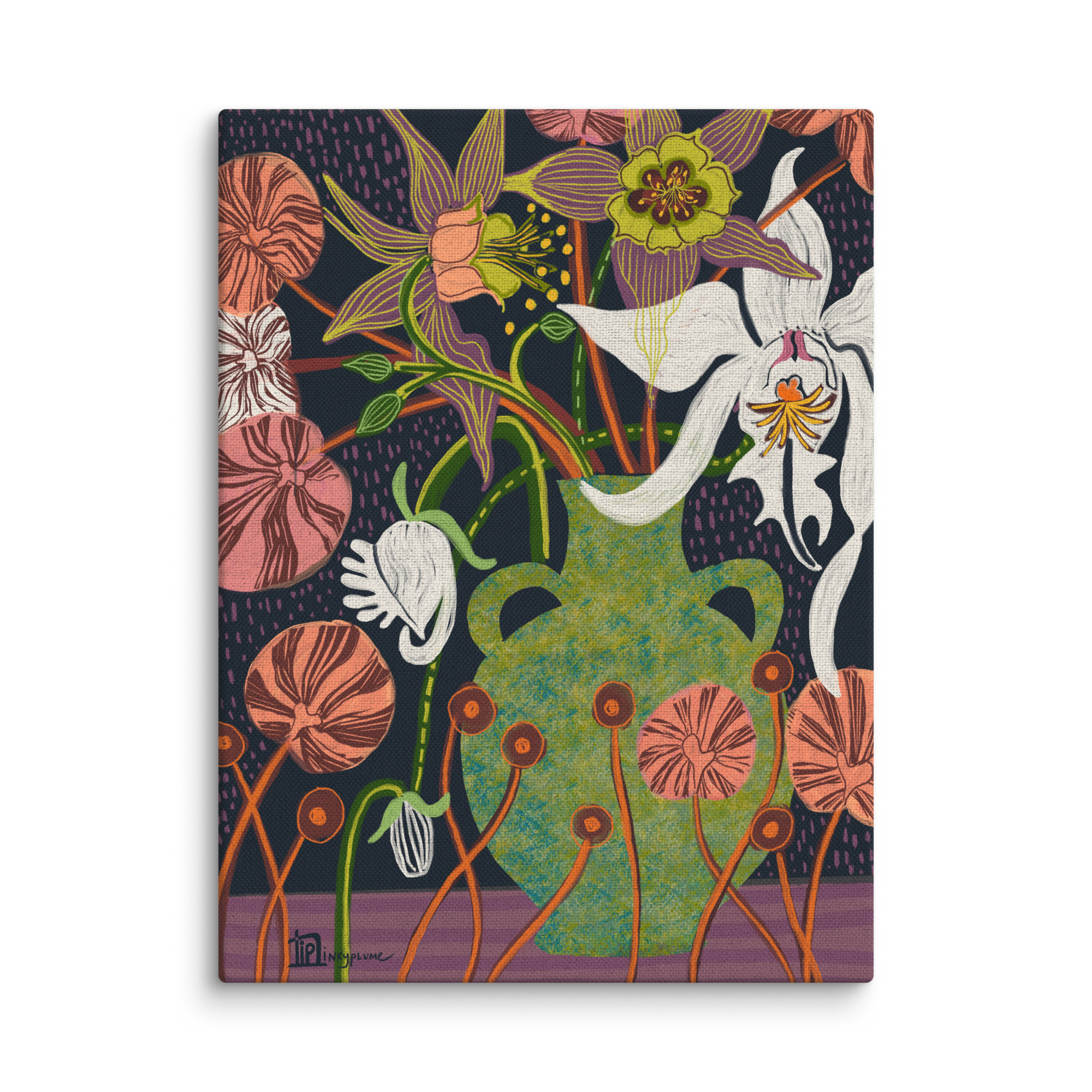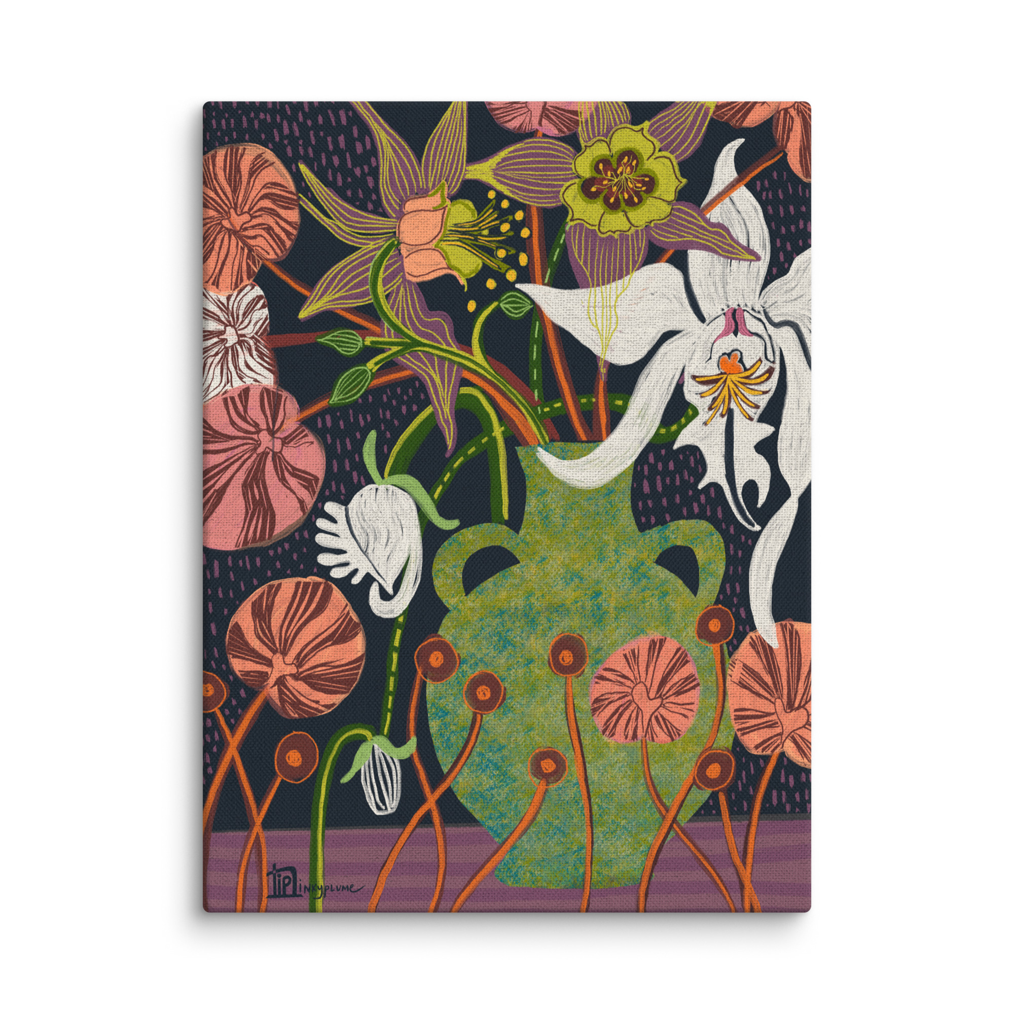 About the Artwork: This enchanting still life features a speckled forest green vessel overflowing with luminous white orchids and intricate, hand-etched purple blooms. The deep, stippled midnight background creates a moody, serene atmosphere that leans perfectly into dark academia, boho, or maximalist aesthetics. Vibrant coral accents and rhythmic line work provide a tactile energy, making this piece a sophisticated focal point that brings a sense of artisanal history to your walls.