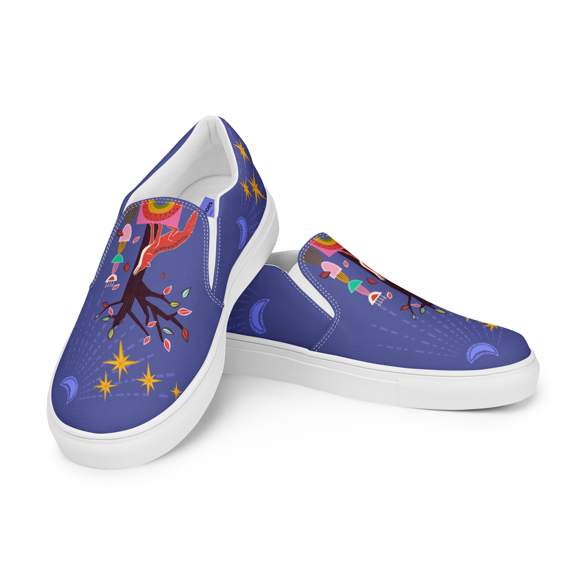 🦊✨ A dreamy red fox gazes up at golden stars and a crescent moon, surrounded by desert florals and playful shapes in bold periwinkle twilight. With painterly details and folk-art charm, this shoe captures the wonder of wild places and night skies.